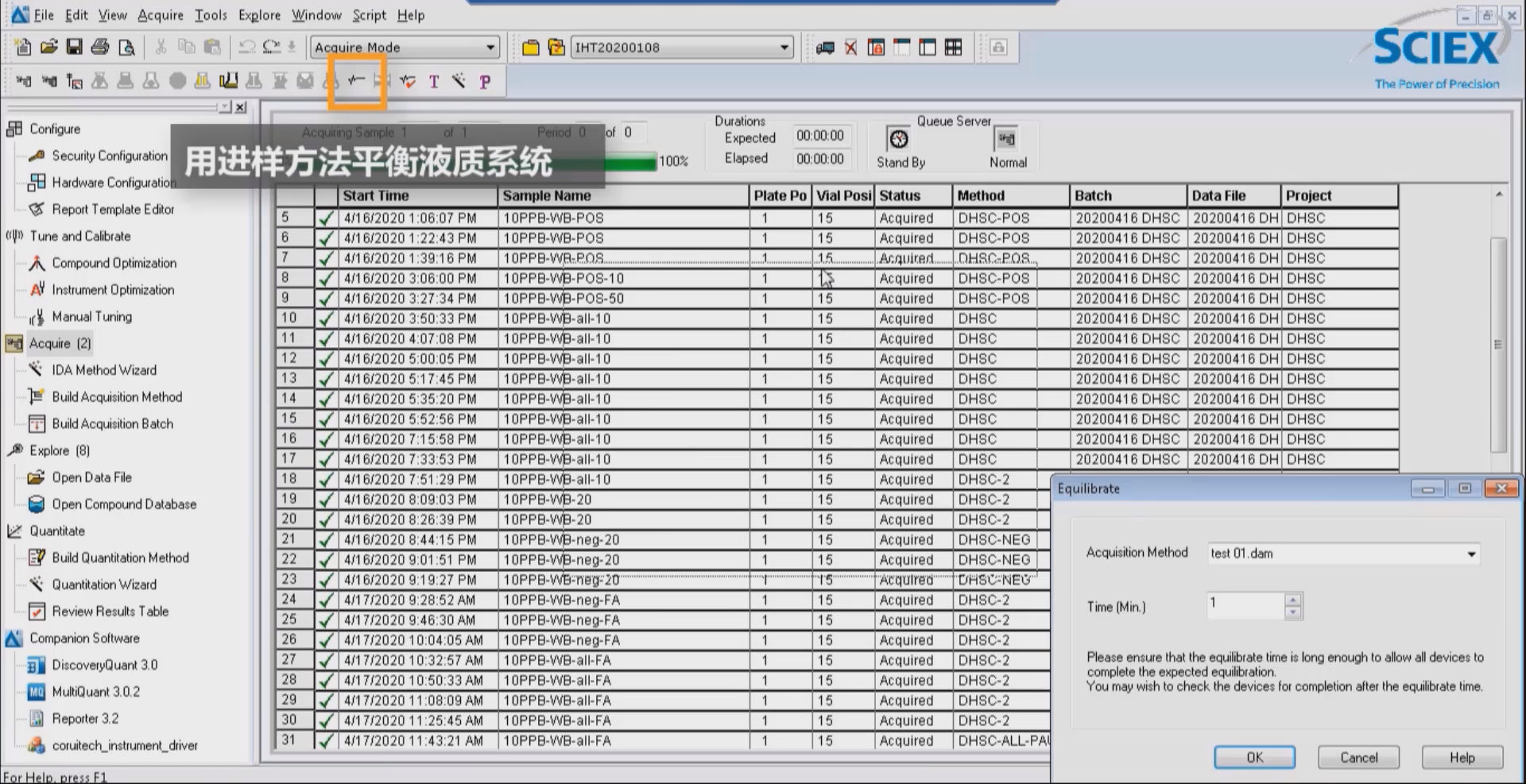 (Equilibrate),打开 Equilibrate 对话框; - 在 Acquitation Method 中选择用于已提交批次的采集方法;
