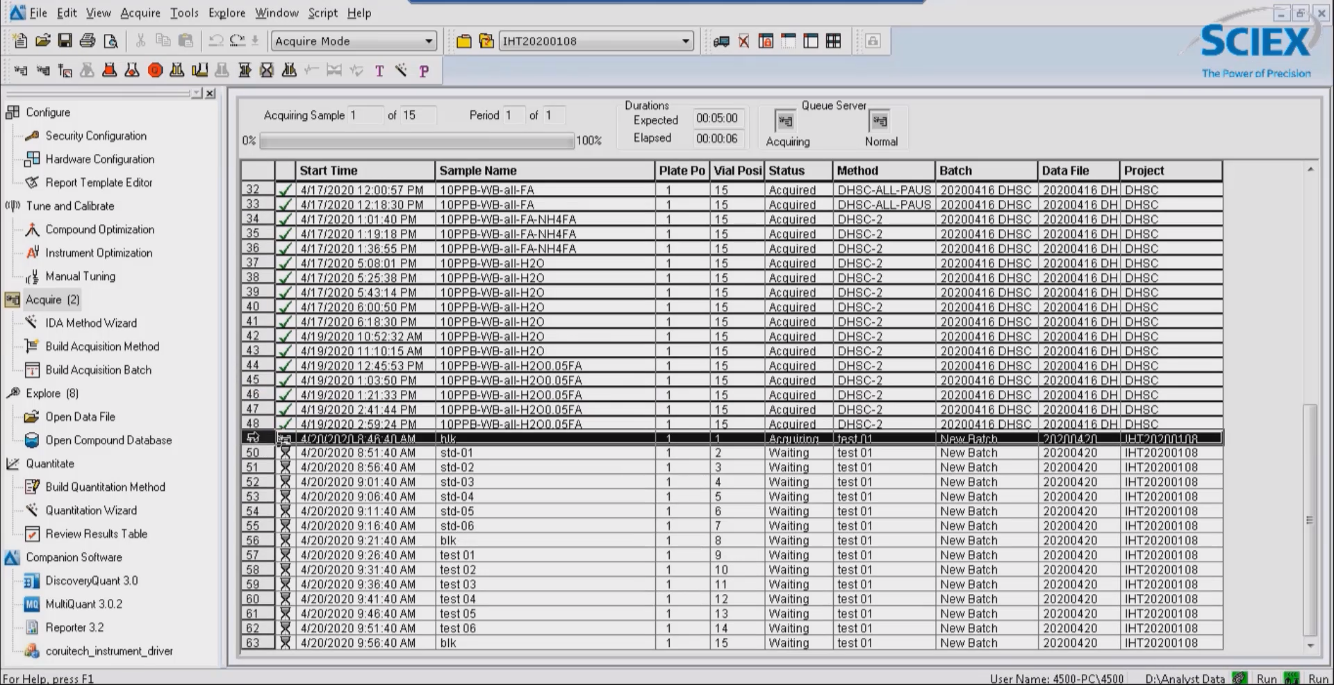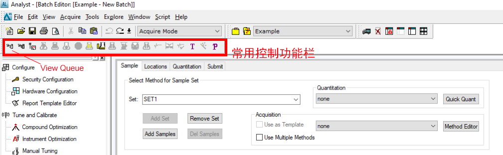 - 提交批处理表后,软件会将批处理表中样品加入队列(Queue)中,此时还不会进样。点击