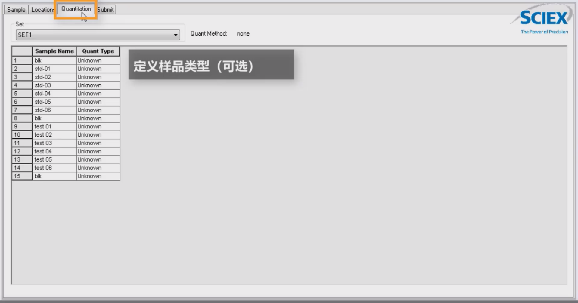 - (可选)在 Quantitation 选项卡中可以设置样品类型,也可以等数据处理时再设置。