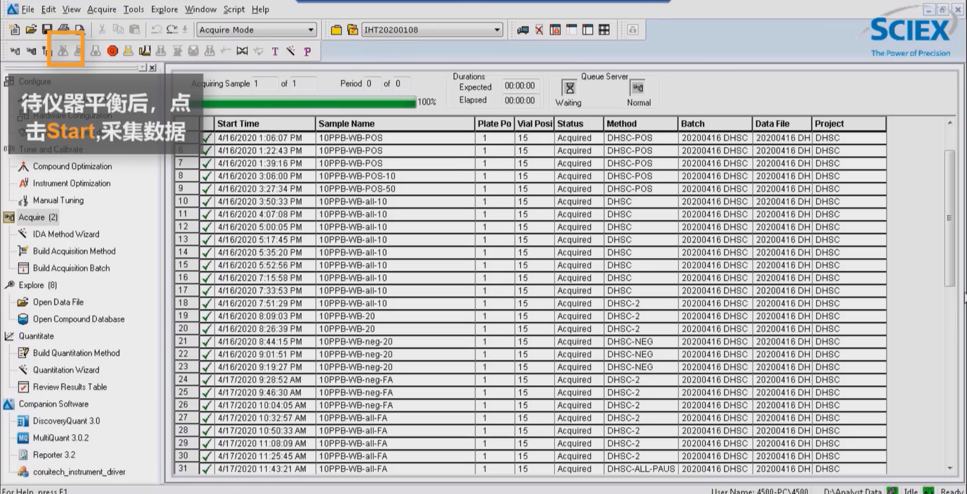 - 开始采集数据:当质谱变为 Ready 状态后,就可点击