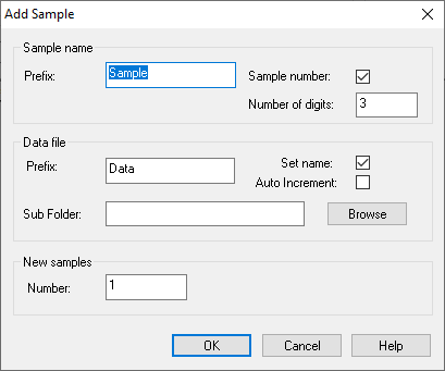 - 继续点击 Add Samples,弹出 Add Sample 对话框,设置相应的样品名信息、数据文件名信息和添加的样品数量。