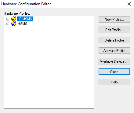 - 在 Hardware Configuration Editor 对话框中选择一个预设好的硬件配置(一般至少包括 LC-MS 联用和单 MS 两个配置本次进行液质联用的批分析,因此选择 LC-MSMS);