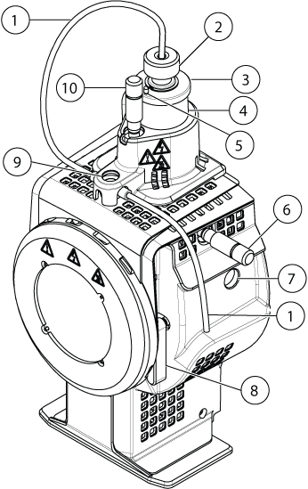 Triple Quad™ 5500+ System 质谱仪如 Figure 2 所示,正面有四个部分:分流阀、离子源、注射泵和面板符号(见 Figure 3)。