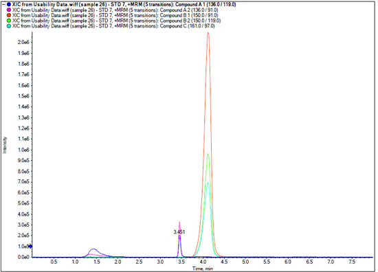 EIC/XIC(Extracted ion chromatogram):通过从一系列质谱扫描中在单个、不连续的质量数或一个质量范围内提取产生的强度数值而创建的离子色谱图。它表示一个给定的质量数或质量范围随时间变化的行为。