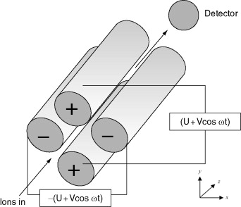 其中一组电极为 \(U + V \cos \omega t\);另一组电极相位与其相差 180°,表示为 \(-(U + V \cos \omega t)\)。