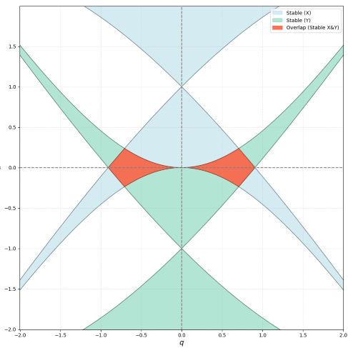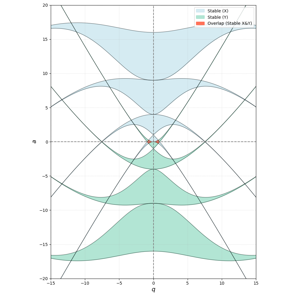 将 Figure 2 和 Figure 3 合并在同一坐标系上,蓝色阴影和绿色阴影重叠的部分(红色阴影),表示当给定电压参数 \((\frac{4zeV_0}{mr_{0}^{2}\omega^{2}}, \frac{8zeU_0}{mr_{0}^{2}\omega^{2}})\) 时位于此区域时,四极杆中的离子在 \(x, y\) 轴上都是有界的;而当电压参数 \((\frac{4zeV_0}{mr_{0}^{2}\omega^{2}}, \frac{8zeU_0}{mr_{0}^{2}\omega^{2}})\) 不在此区域时,离子运动轨迹最终会发散,撞上四极杆被中和。