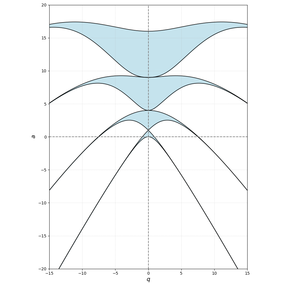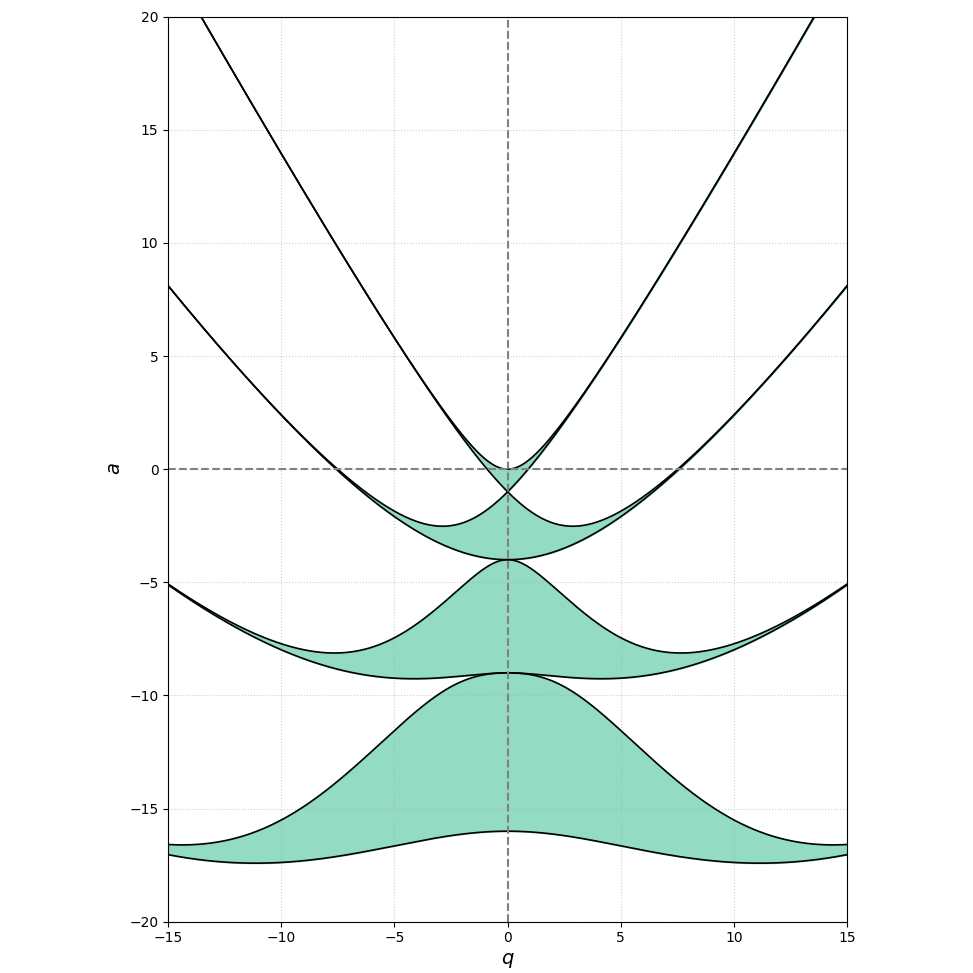 如果用 Mathieu 方程来描述一个系统的运动(位移 \(x\) 随时间 \(t\) 的变化),当参数 \((q, a)\) 位于稳定区时(Figure 2 中阴影部分),系统运动始终有界——无论过多久,位移都不会超过某个有限范围;当 \((q, a)\) 位于不稳定区时,系统通常会指数发散——随着时间推移,振荡幅度越来越大,最终趋于无穷。